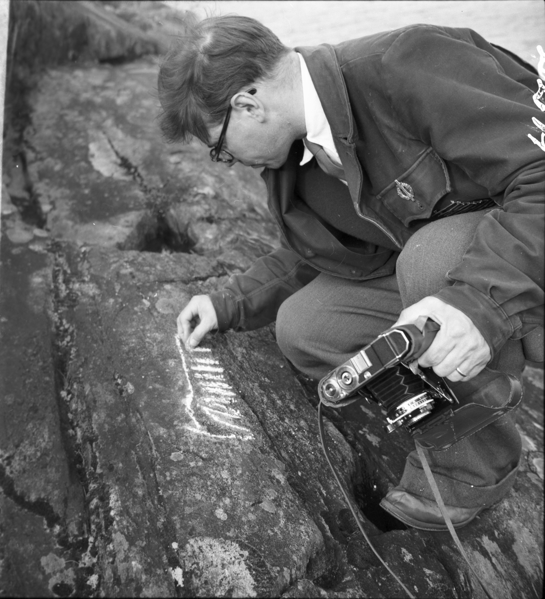 Landsantikvarien Hallbäck målar i hällristningar. Bolstad