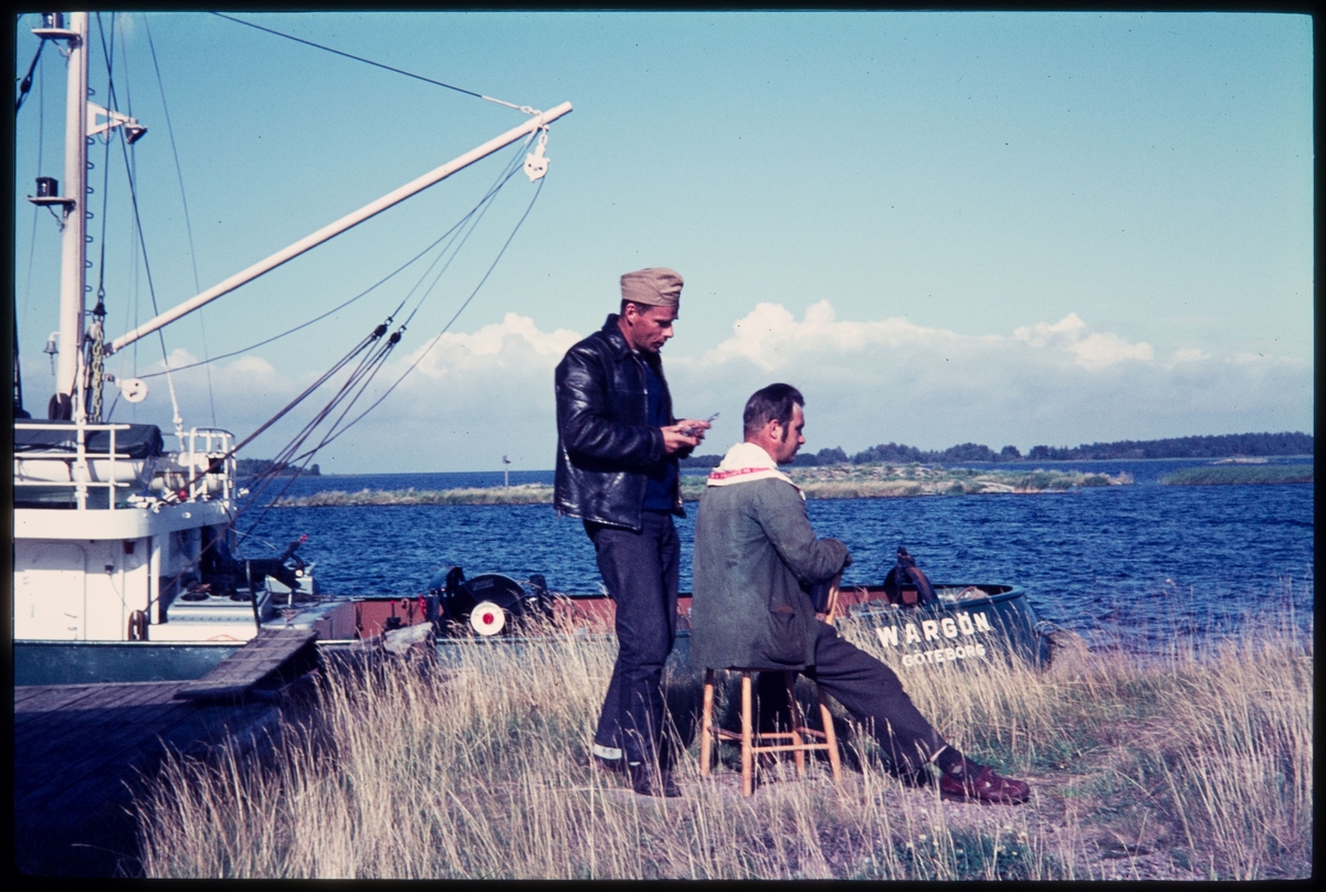 Aspholmen, Lurö skärgård. Maskinisten Sven Erik Blom klipper styrman Harald Magnusson.