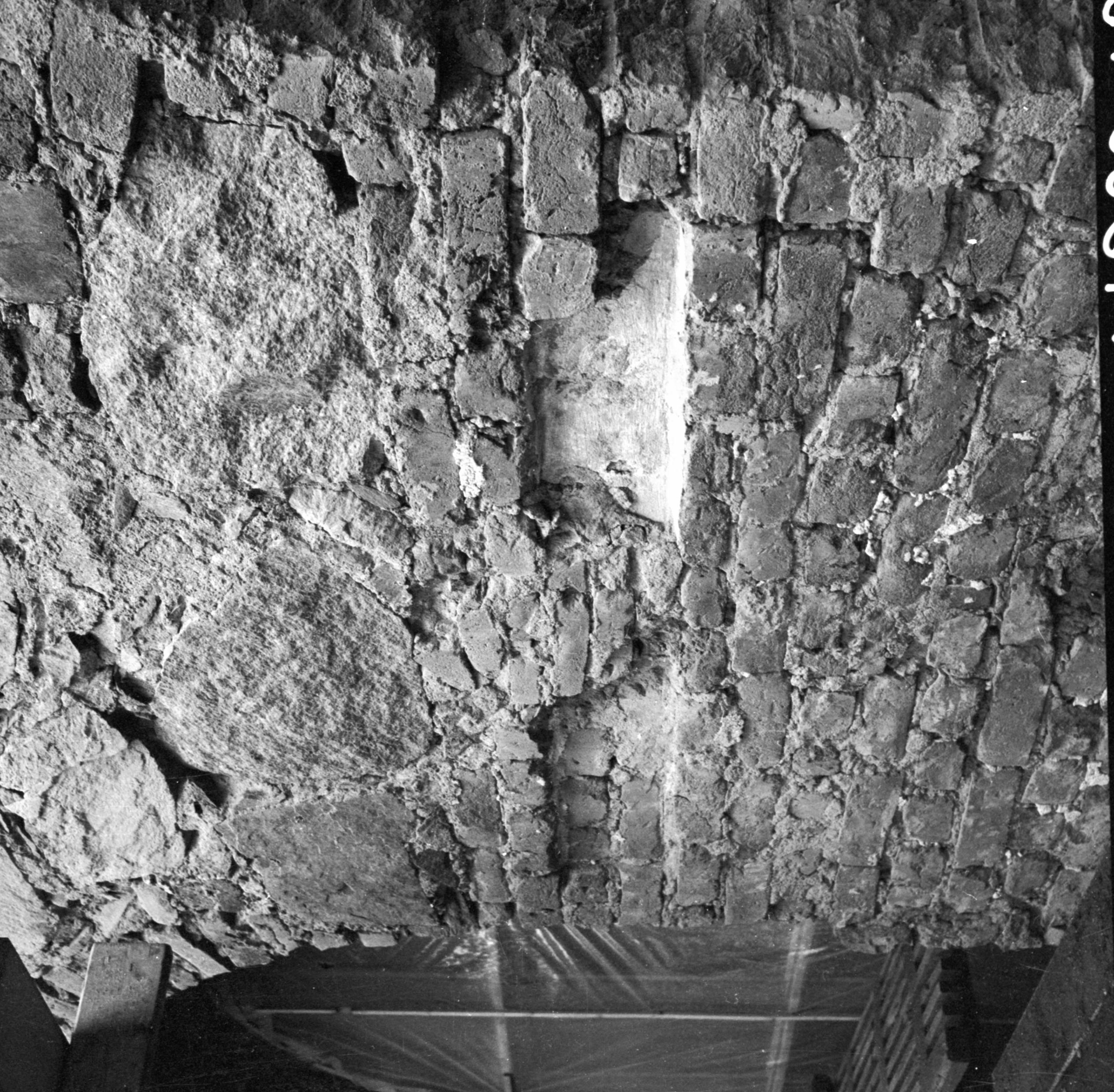 Blinderingsbandet i det påbyggda partiet av sydfasadens västra del. Byggnadshistorisk undersökning i samband med omputsning 1963. Foto nr. 37.
