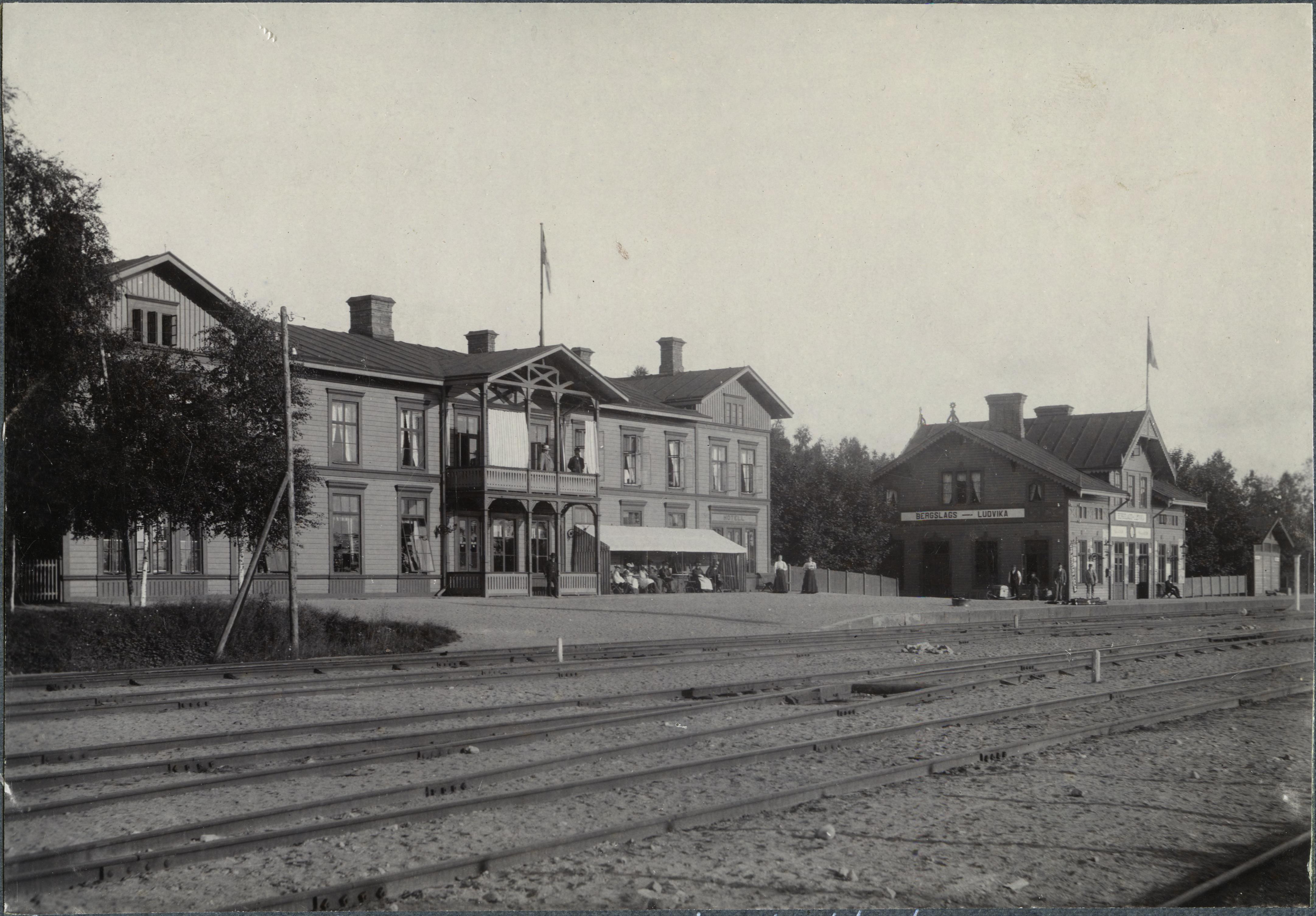 Järnvägsstationen Bergslags- Ludvika till höger och järnvägshotellet till vänster.