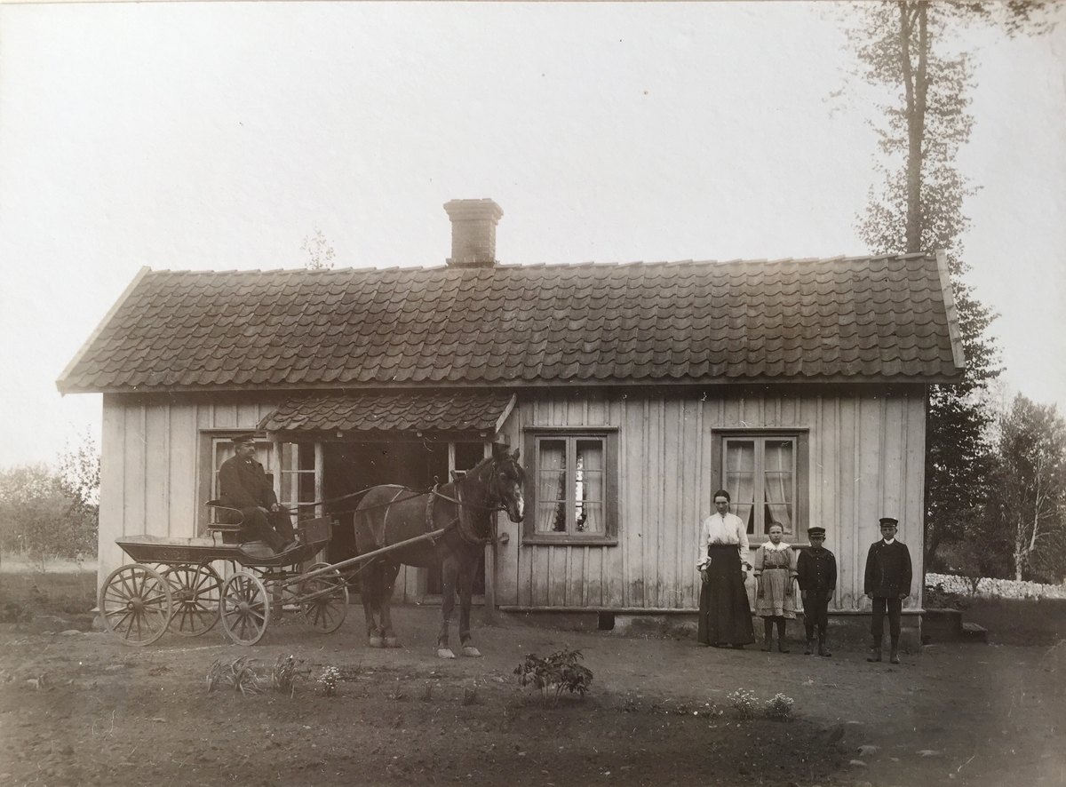 Vänersnäs. Slaktare Erik Johan Floberg, tillsammans med sin hustru Lovisa och barnen Berta, Helmer och Libert, framför sitt hus vid Hallsdal.