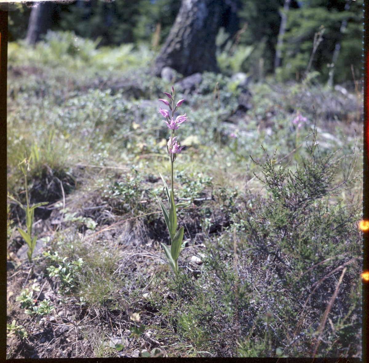 Orkidén Rödsyssla, Cephalanthera rubra. Tisselskog