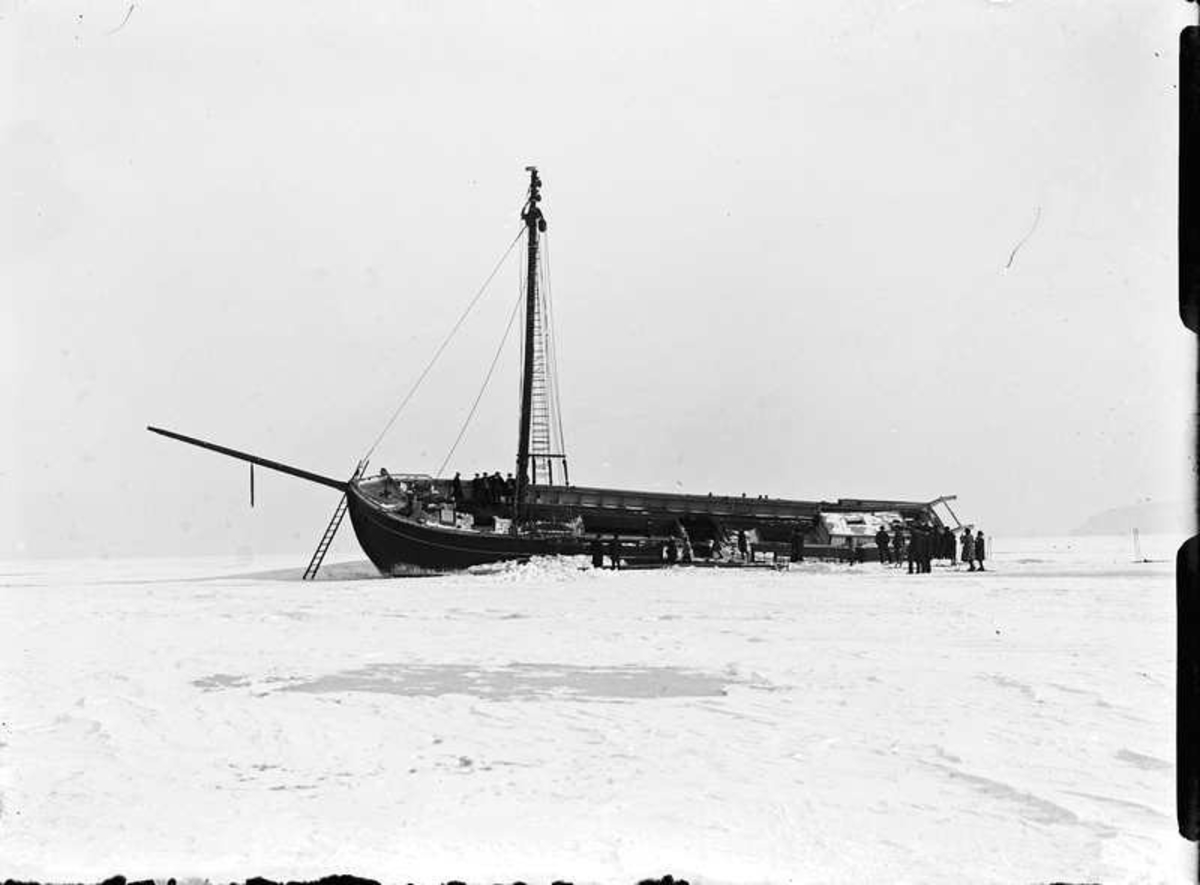 Förlist skuta i isen utanför Vänersborg. Sannolikt är detta skonaren Concordia som gick på Normansgrundet 23/10 1921.