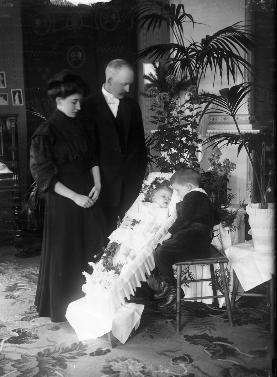 Familjebild. Föräldrar står vid sitt yngsta döda barn i kista. Sonen sitter brevid och lutar sig mot kistan.