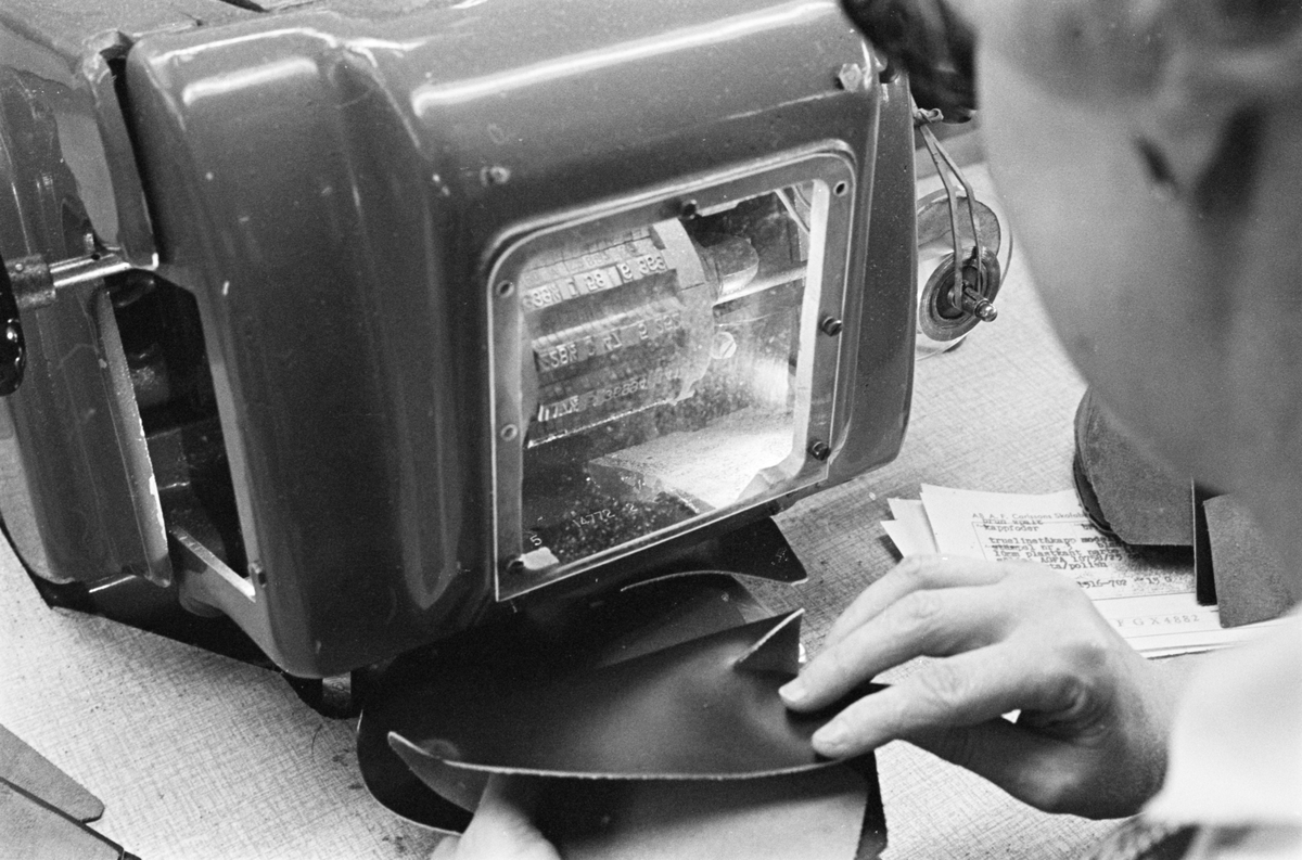 Nummerstämpling. Text från inventering "Vid stämplingen stråla de olika ovanlädersdelarna, blad, skaft, skinn- och tygfoder och så vidare första gången samman. I maskinen ovan, som är från ca 1960, stämplas de med storleken och med partinumret samt eventuellt med det tidigare nämnda färg- eller parstämplingen".