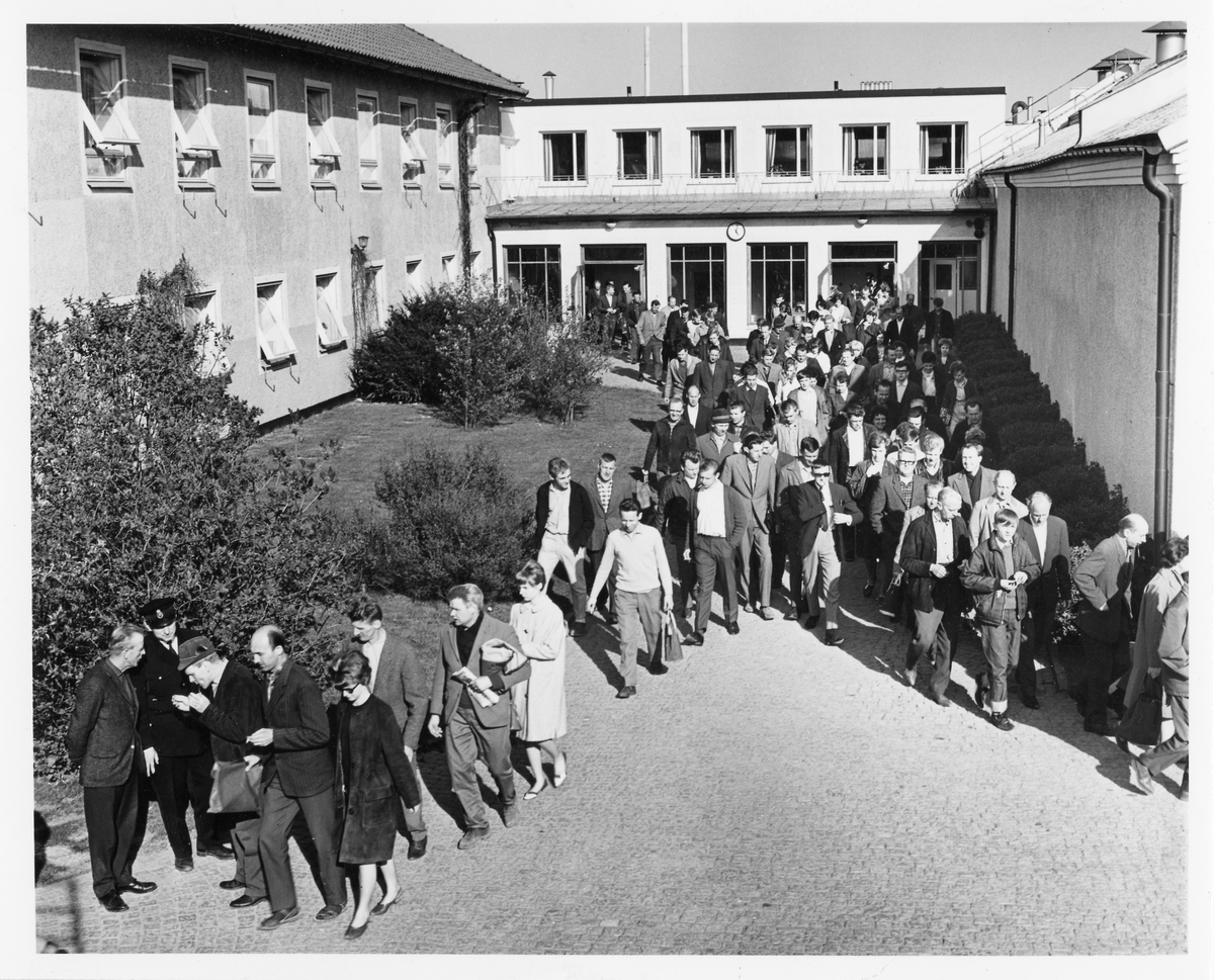 Vänersborg. Televerkstaden / Teli AB. Anställda slutar för dagen.
