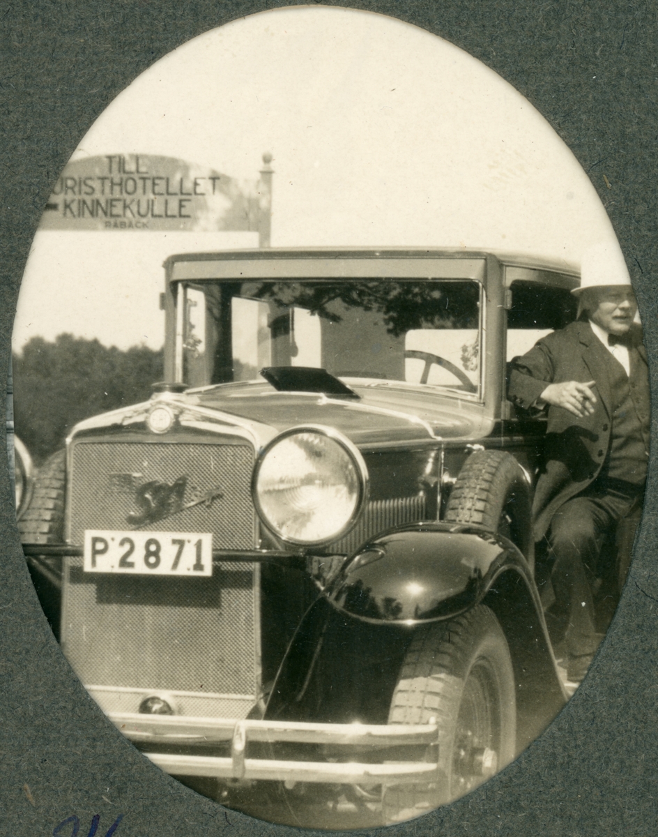 Bilutflykt. Text på skylt: " Till turisthotellet Kinnekulle. Råbäck"