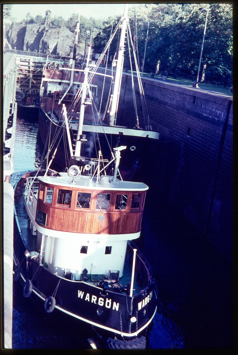 Trollhättan. Bogserbåten Wargön slussar med haverist