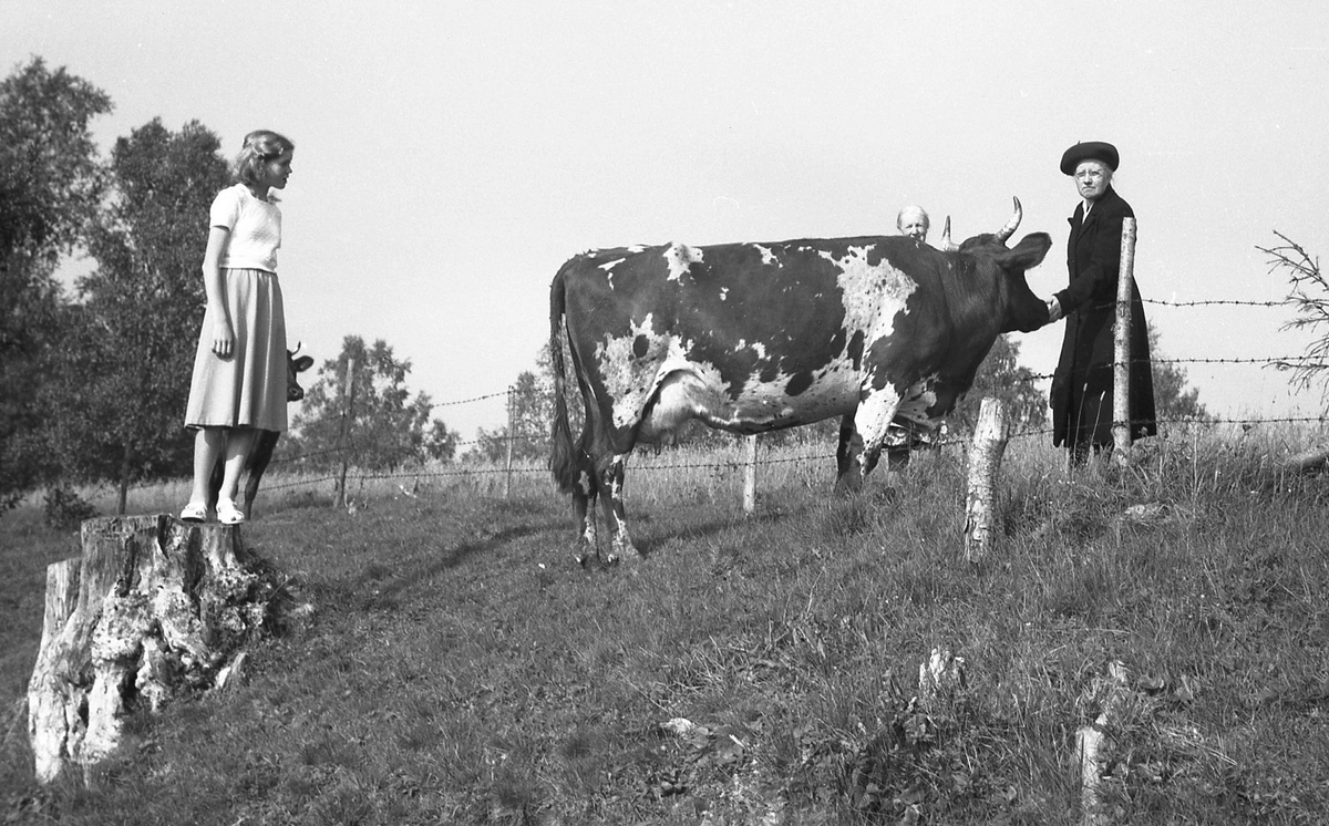 Gesäter, gården Holkan. Kossan Runa på bete har fått besökare
