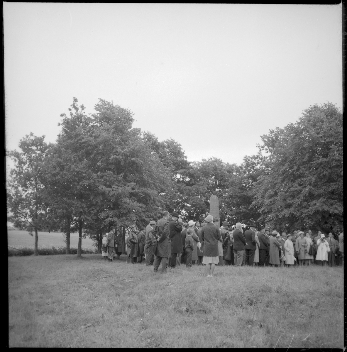 Titel: Gestads kyrka. Minnesceremoni vid Friherre Axel Erik Roos (1684-1765) gravmonument. År 1919 restes två minnesstenar, den ene till minne av den gamla kyrkan och kyrkogården, den andre till minne av friherre Axel Erik Roos.