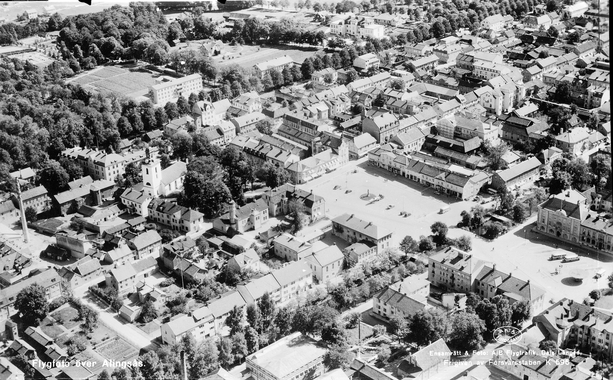 Text på bild:" Flygfoto över Alingsås" Innerstaden med torg och bomullsväveri