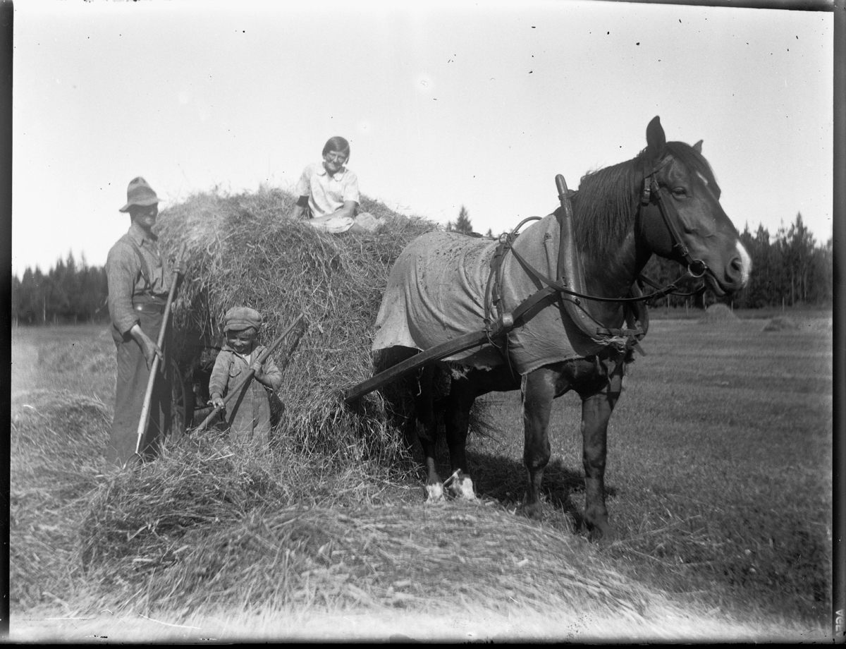 Hökörning i Draghagen. Albert Larsson med barnen Per Larsson och Birgit Britta Bråberg f. Larsson. Hästen är Docka.