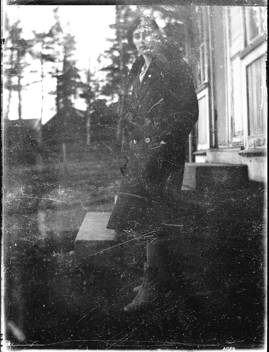 Greta, stående vid verandatrappan, vid sitt första besök i Siviken.