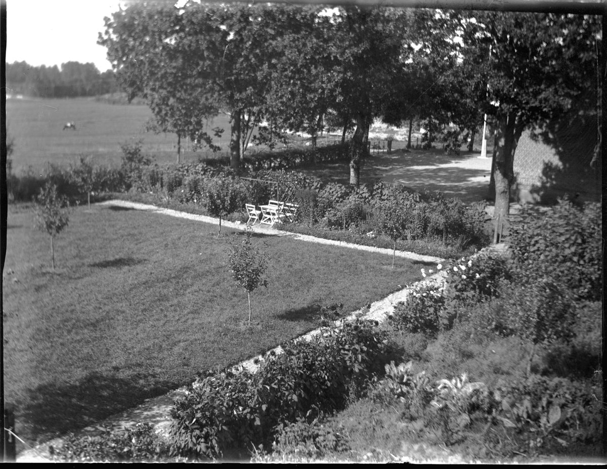 Sommarbild i trädgården (från 2:dra vån. Fönster). Vy över trädgården.