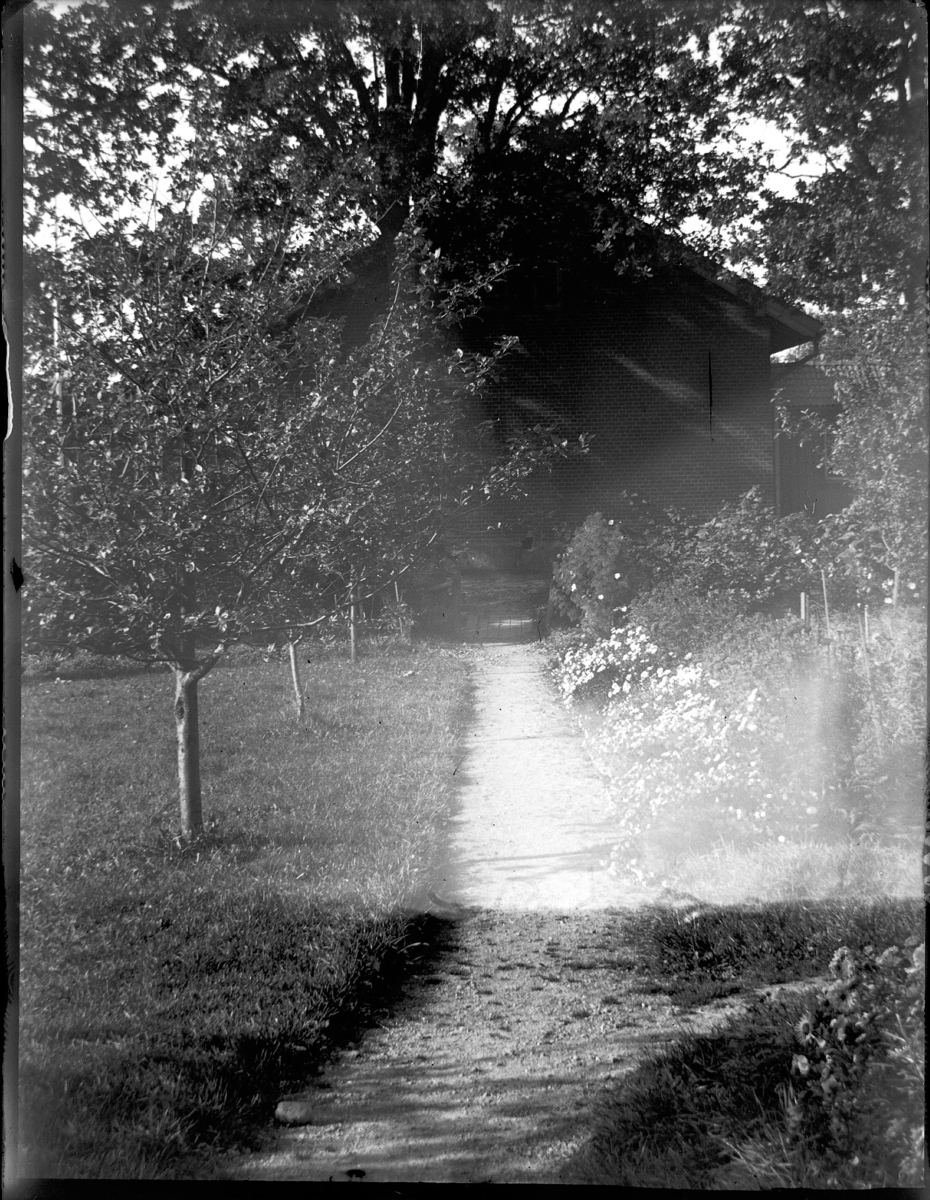 Sommarbild: Trädgårdsgången till skolan 1941. (Försök m. klappkamera 9x12)