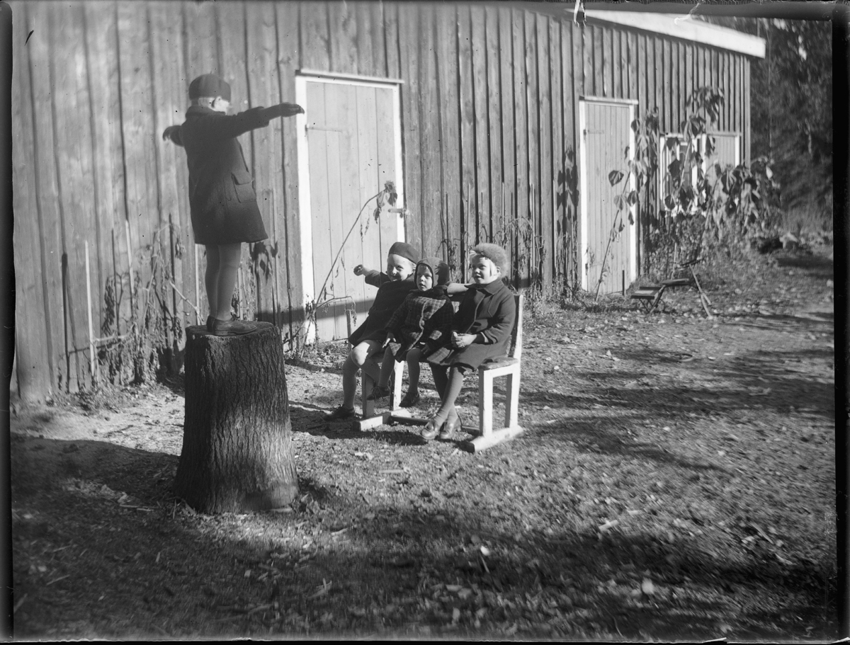 Sommarbild. Gunnar leker sånganförare för Ethel, Tore och Bengt-Ola.