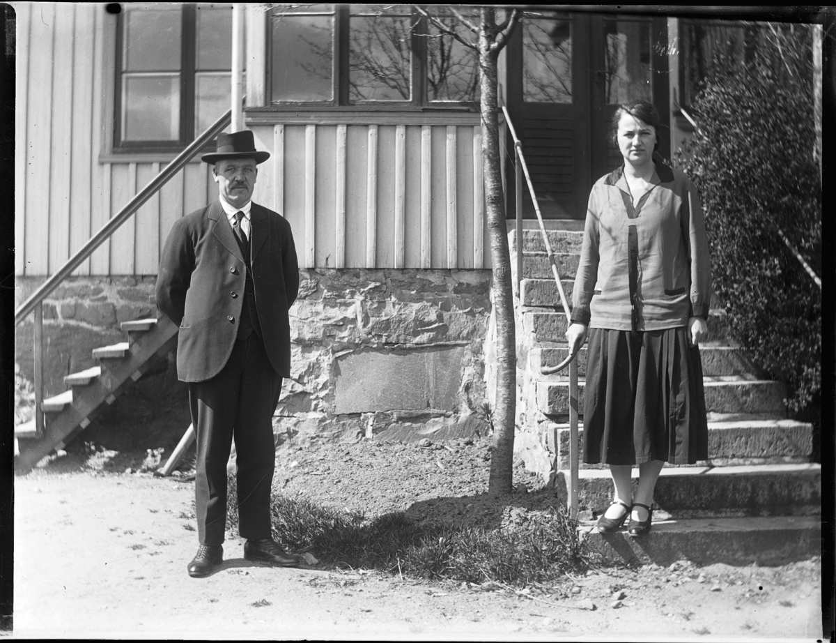 Folkskollärare K.J Liebert och lärarinnan fröken Henny Norrie vid trappan till skolans trädgård.