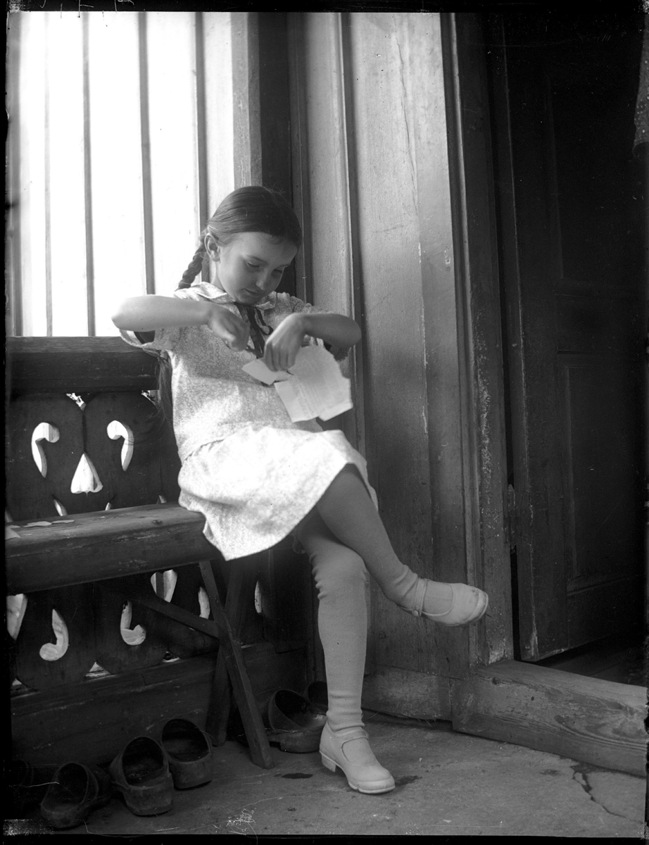 Lill-tösen i Brinkagården, sitter på verandan och klipper pappersfigurer.