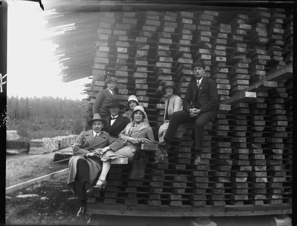Tibro - Beatebergs-utflykten: Ressällskapet uppklättrat på en brädstapel.