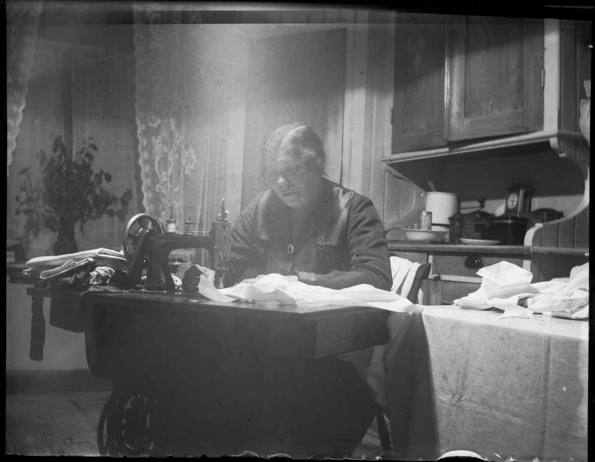 Hedåsgatan 19. Vilhelmina (Mina) Nilsson vid symaskinen i köket.