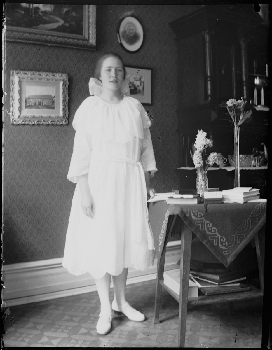Hedåsgatan 8. Signe Holmer i konfirmationsklänning.