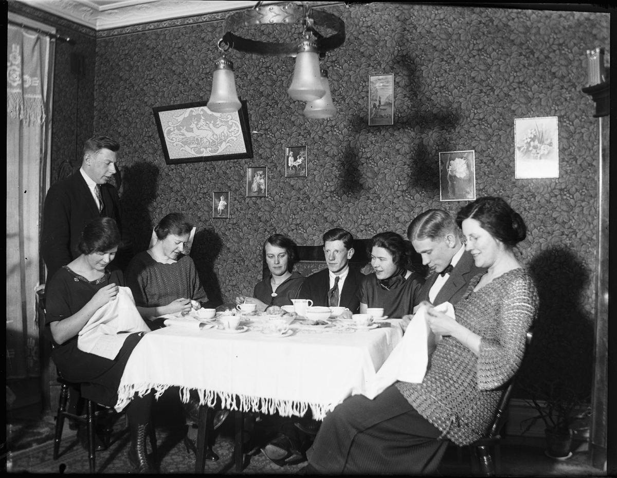 Gruppbild. Sällskap vid dukat bord