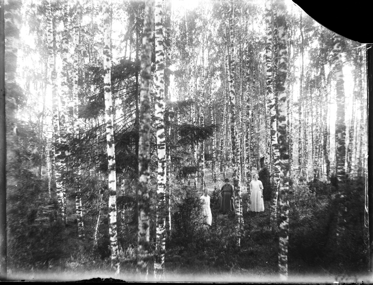 Titel: Högerud. Grupporträtt av tre kvinnor i skogen