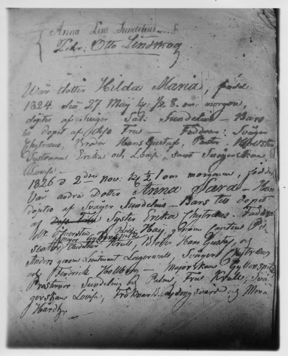 Brålanda. "Om Hilda Maria och Anna Sara Sundelius dop"