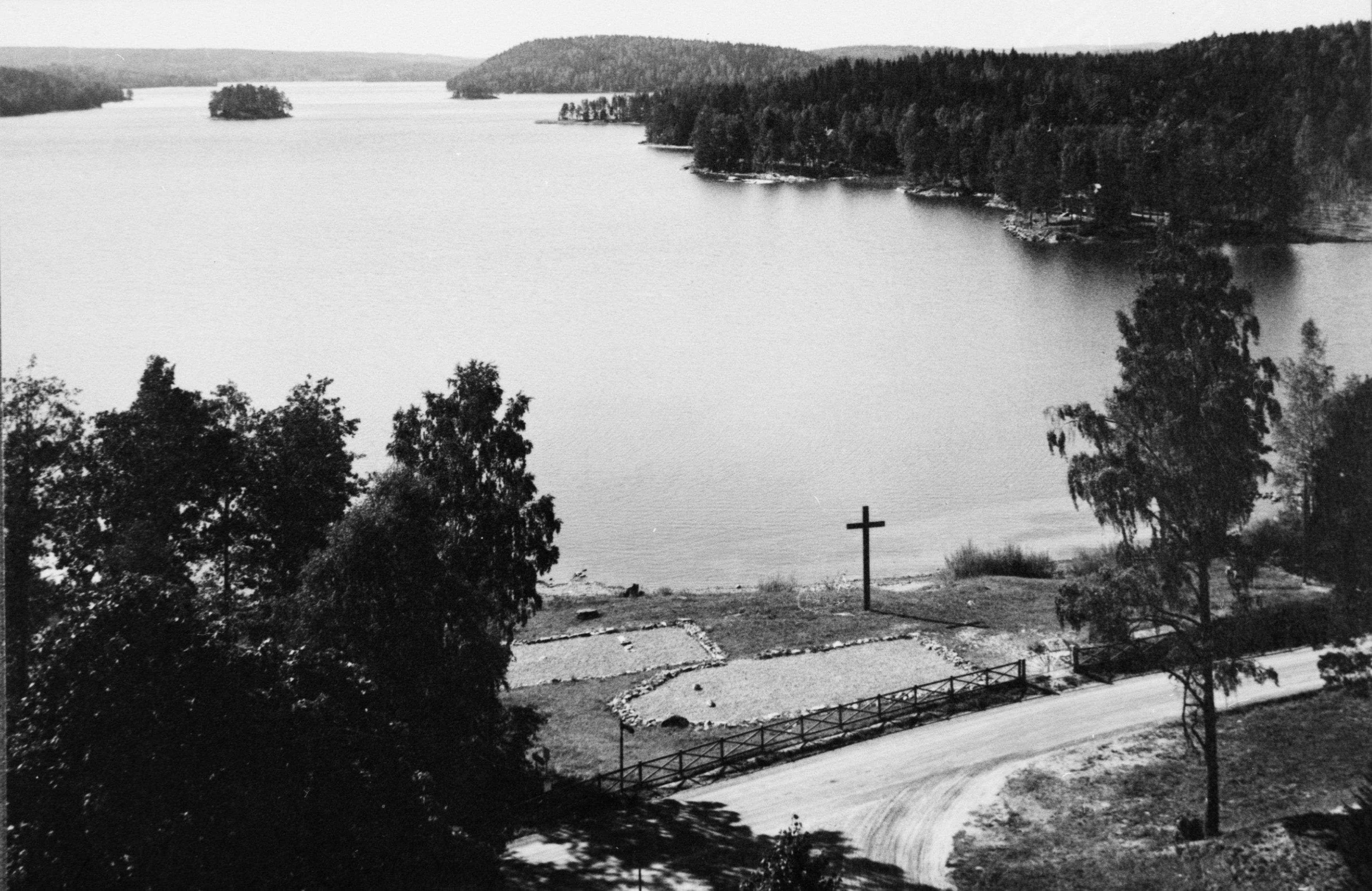 Utsikt från Värmskogs kyrkas torn mot söder över sjön Värmeln. Närmast vägen grunden efter 1600-tals kyrkan och intill stranden grunden efter 1200-tals kyrkan. Till höger Klockkullen. Kyrkogården restaurerades 1947-1948 av Riksantikvarieämbetet och invigdes 15/5 1949 av biskop Arvid Runestam.
