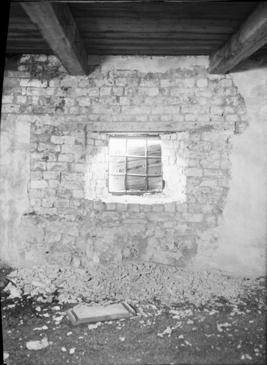 Ett av de västra fönstren på södra långväggen i nuvarande andra våningen. Något av ursprunglig fönsteröppning synes ej. Tösse ödekyrka