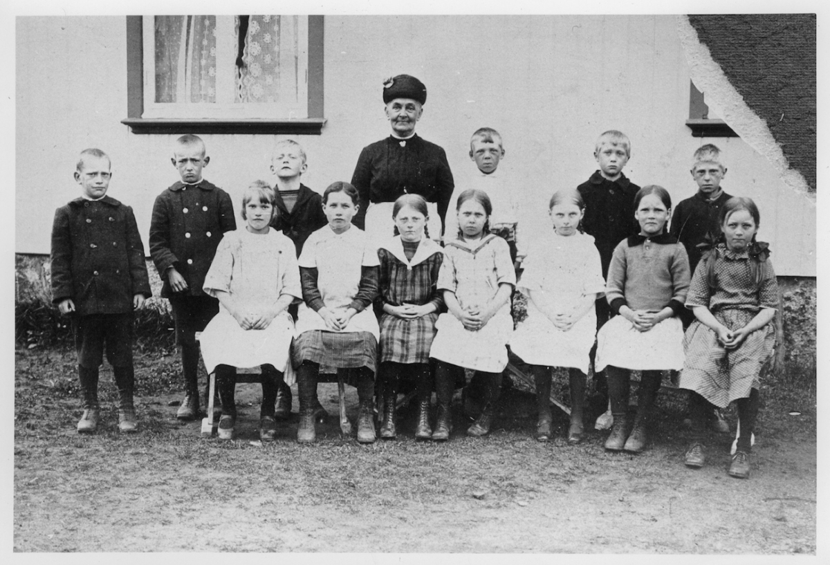 Gestad, Åstebobergs småskola. Flickor och pojkar och en lärarinna.