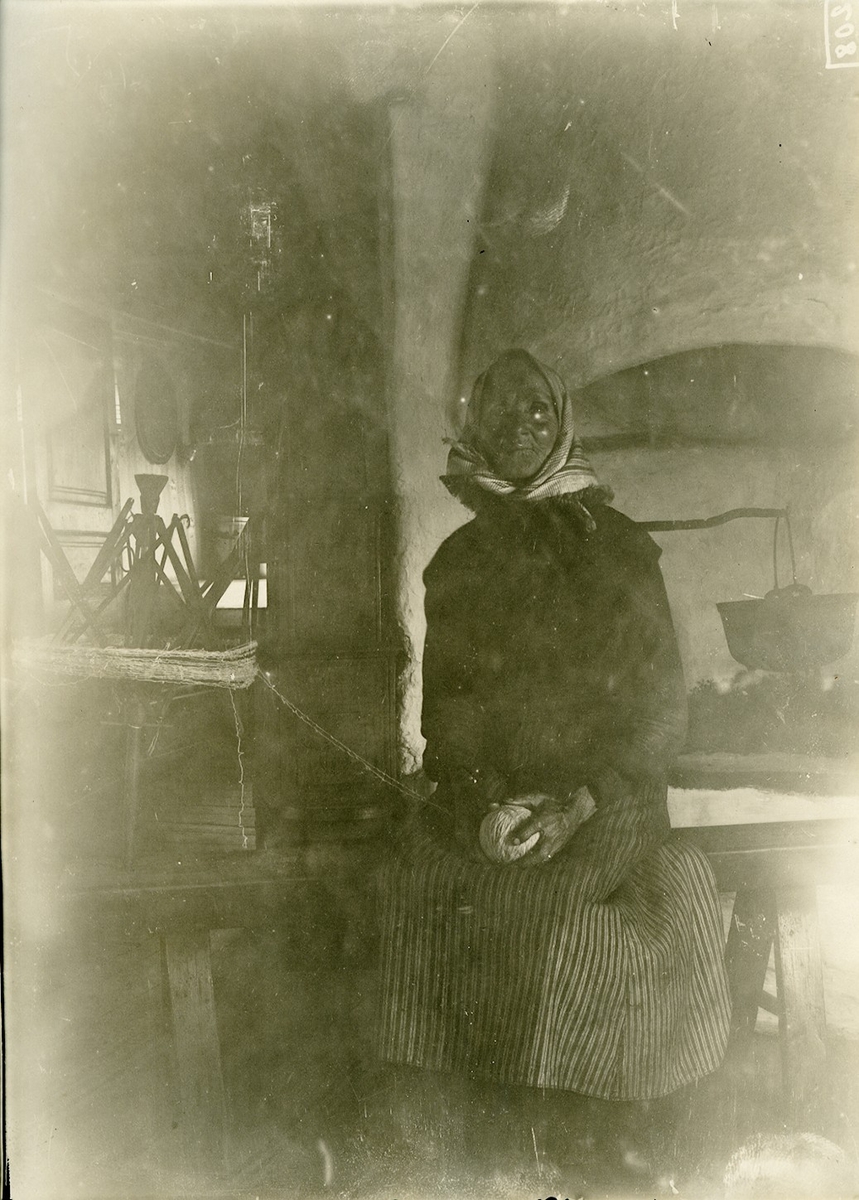 Nössemark. Nystekvinna. Kvinna med nystvinda vid öppen spis
