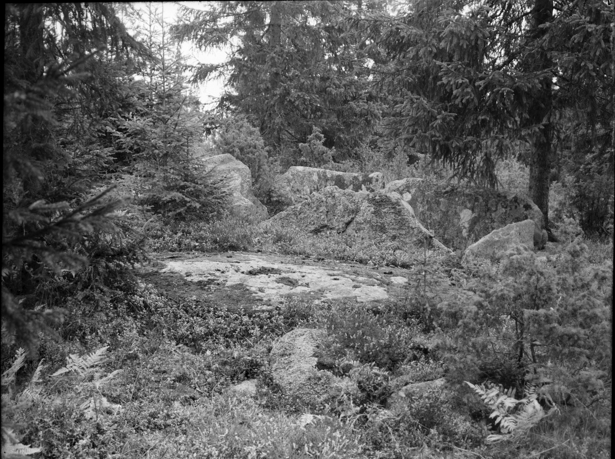 Titel: Hällkista i förgrunden (A) takhäll med skålgropar Råggärd