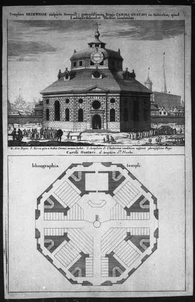 Tryck av kyrkan mot norr med planritning och Jean de la Vallées förslag. Ur Suecia antiqua.