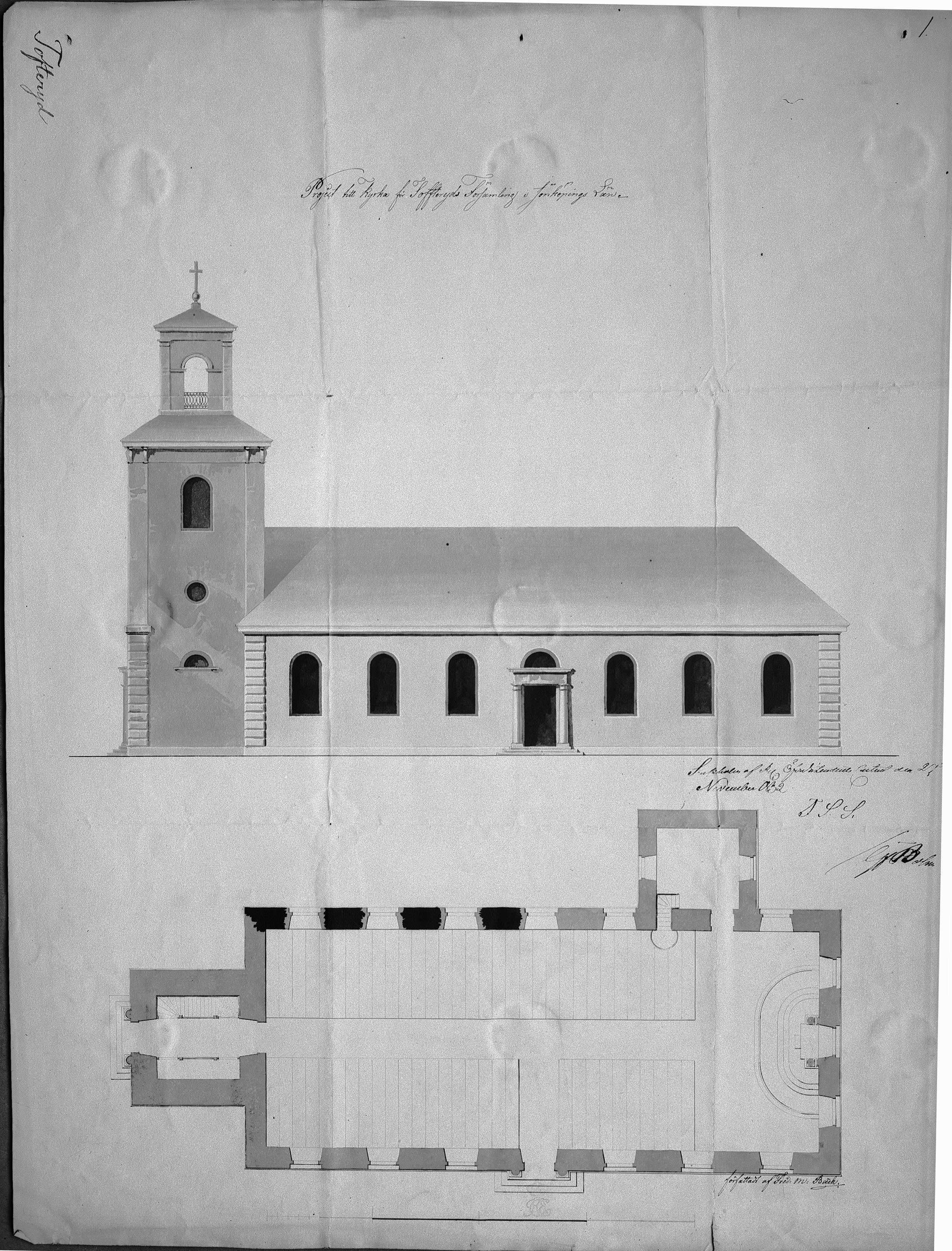 Kyrkan mot söder, ritning av Fred M Bäck 1832, avfotograferad. Kungliga byggnadsstyrelsens arkiv.