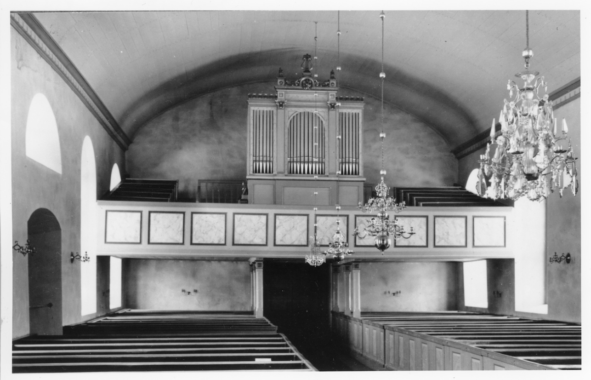 Interiör. Del av läktare och orgel. Kölaby kyrka