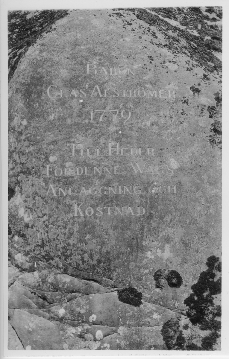 Inskription i bergväggen vid Jonsered till minne av Alströmers väganläggning. Lerum