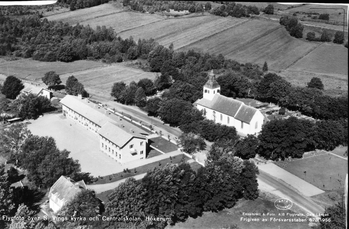 Text på bil: "Flygfoto över S. Vings Kyrka och Centrumskola Hökerum"