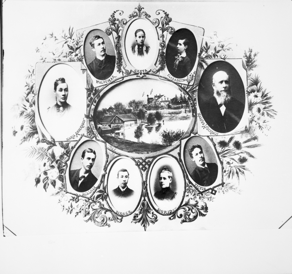 Familjekort Stigen. Sammansatt foto. Magnus och Maria Andersson, Valdemar, Greta, Elisabeth, Hjalmar, Birger, Sigrid, Viktor - i mitten parti av Stigen.