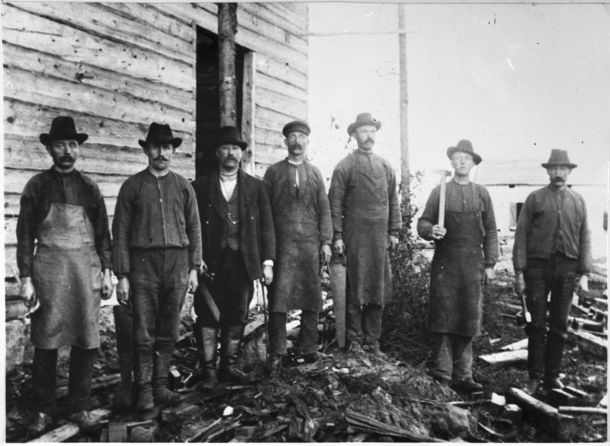 Hos bröderna Eriksson då ladugården ombyggdes. Snickarna är så kallade aleknoppar-snickare från Ale härad som då besökte bygderna runt Vänern. Järn