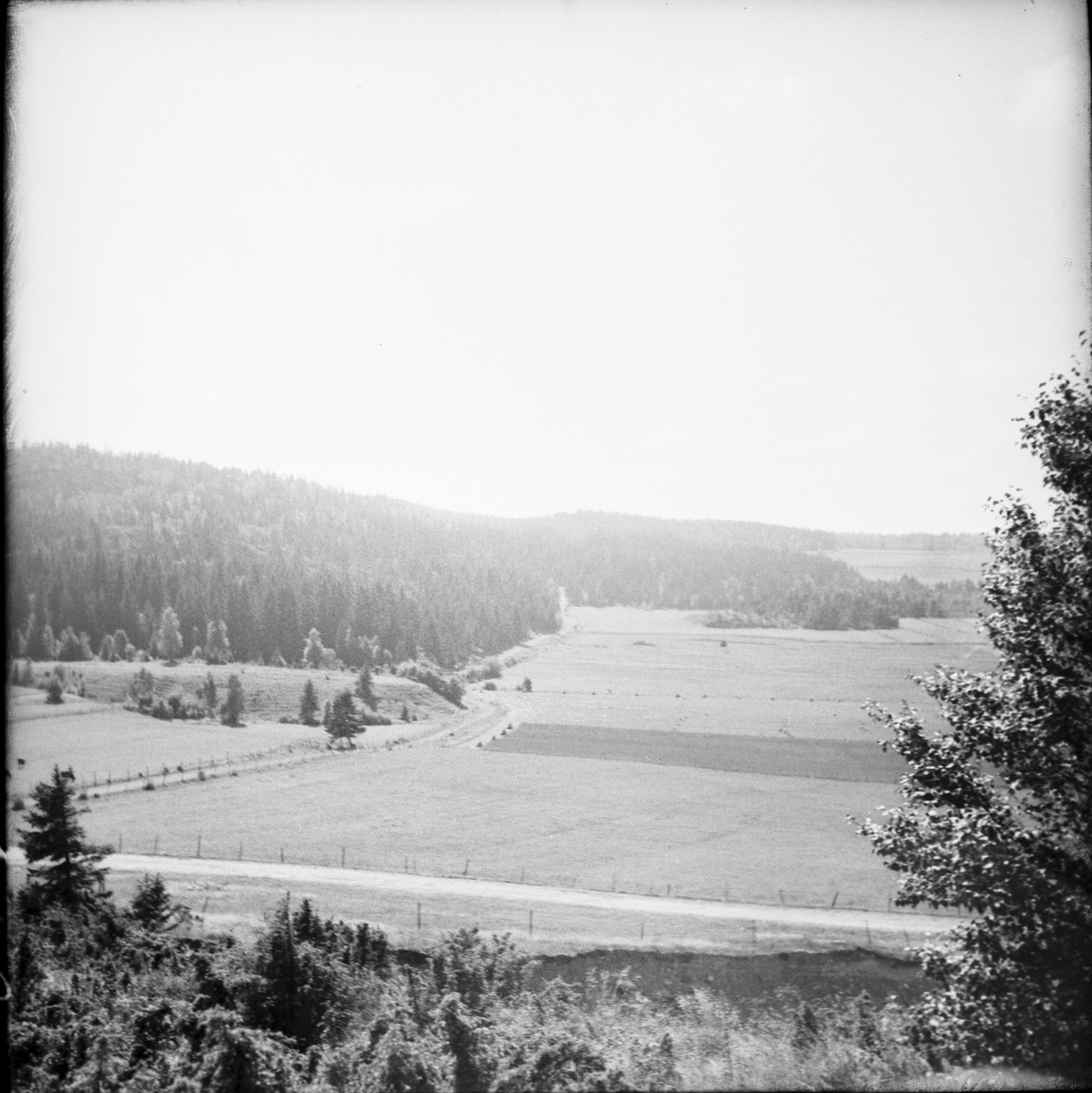 Utsikt åt söder från gravfältet. Till vänster gamla vägen till Gudhem.