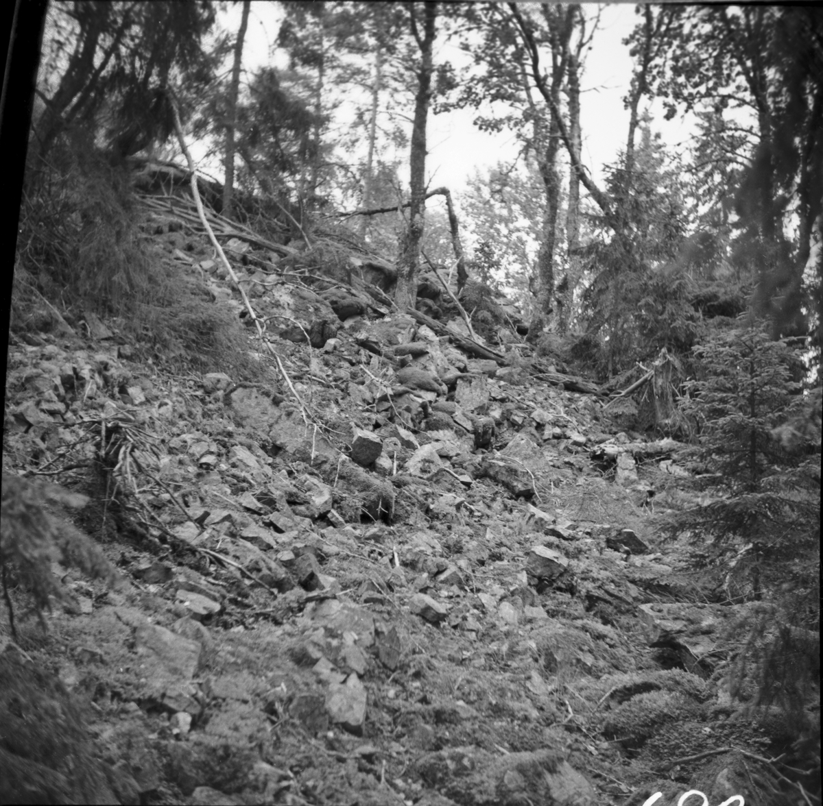 Fornborgens nedrasade mur på västersidans södra del från nordväst. Taxviken Steneby