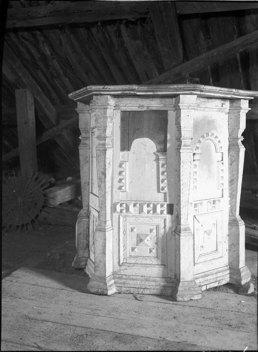 Predikstol daterad 1637, under 1932 förvarad på vinden i Ryrs säteri. Valbo-Ryr kyrka