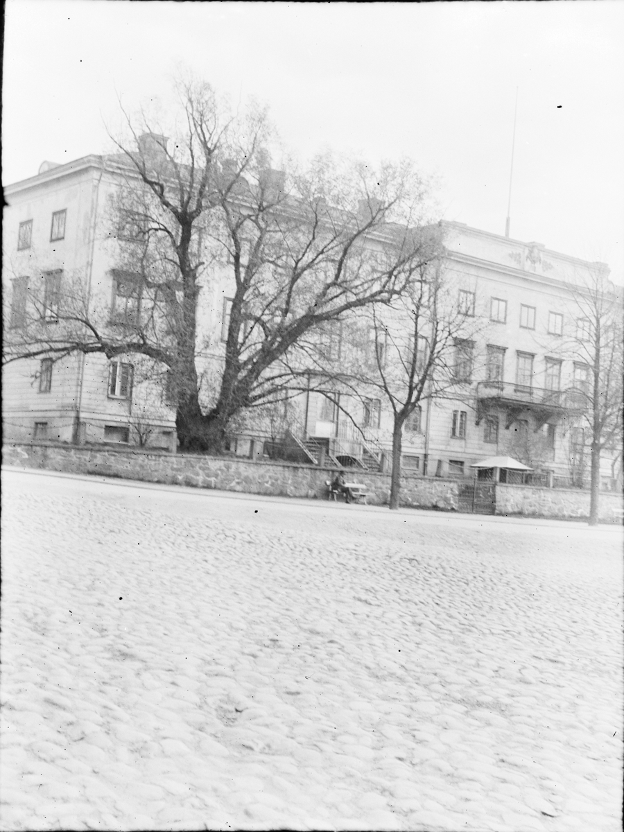 Residenset med ett par stora pilar i förgrunden. Nedsågade omkring 1958, Vänersborg