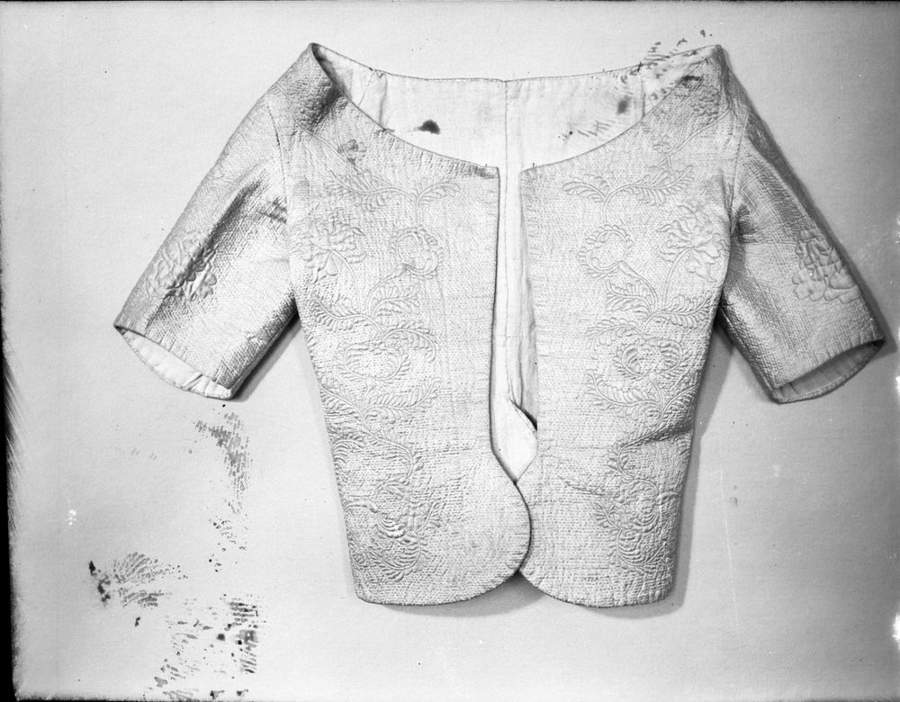 Brudliv av vitt siden matelaserad med blomdekor. Foder av linne. Vänersborgs Museum