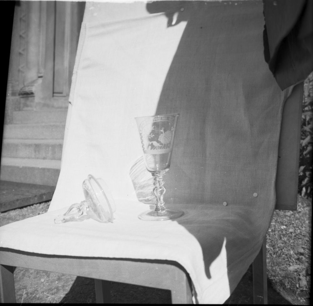 Vinglas, svagt rosa, etsat och inskrift på tyska. Vänersborgs Museum