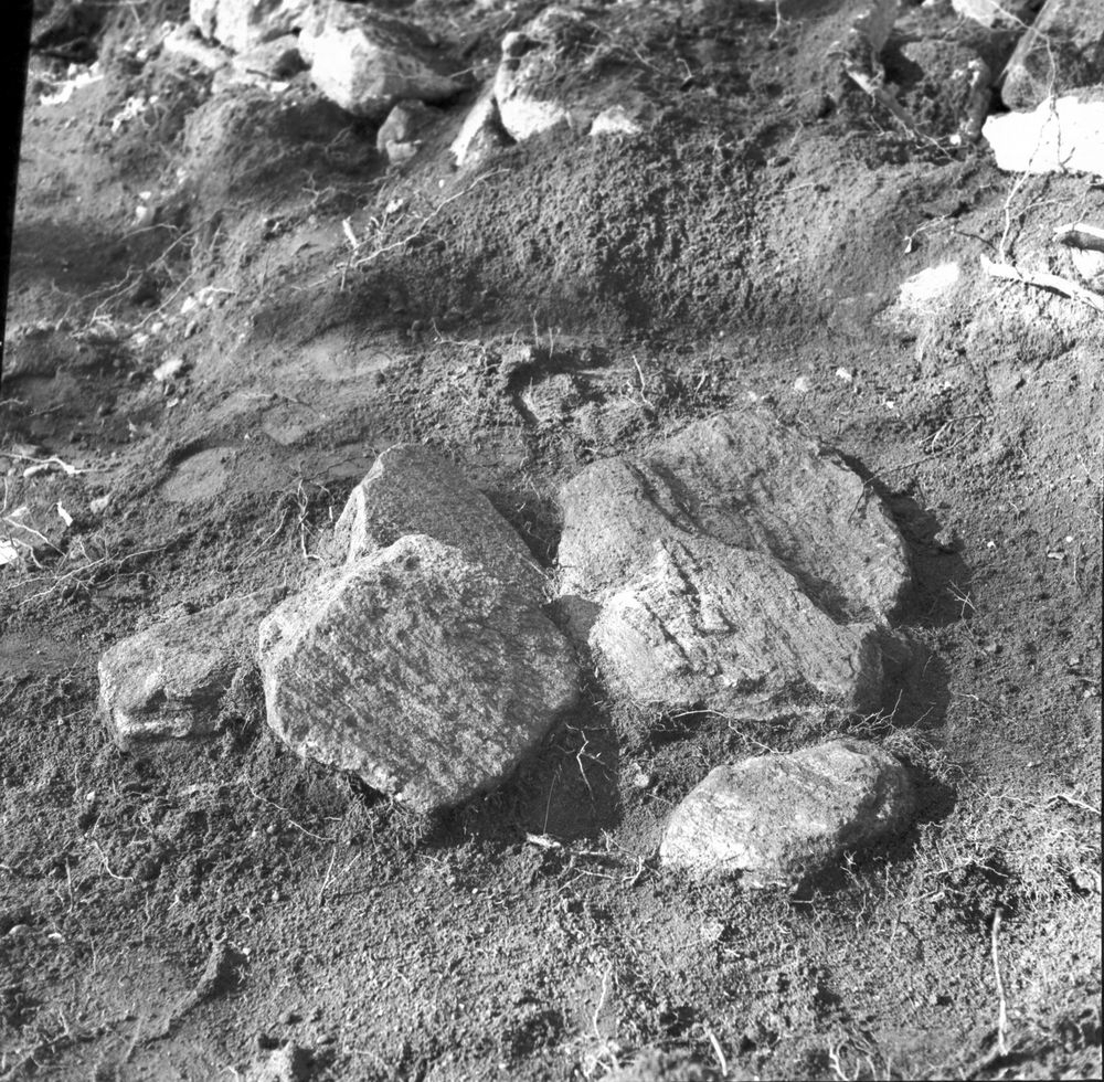 Grav 1. Stensättning med lerklining under stenkedjan i väster från nordnordost. Ingareds gravfält