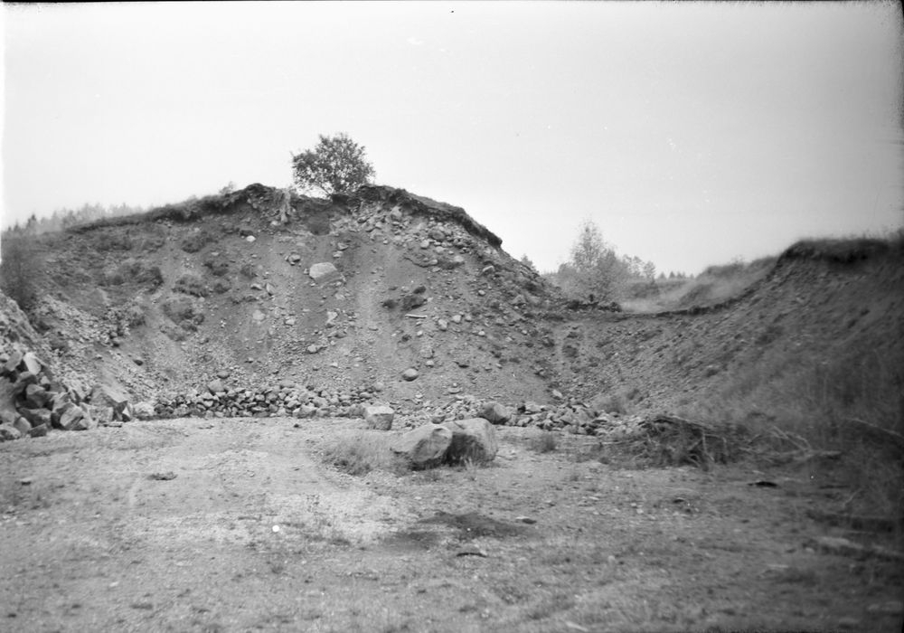 Hällkista vid grusgrop på Ingemarstorp. Hällkistans läge:trädet står i hällkistan.