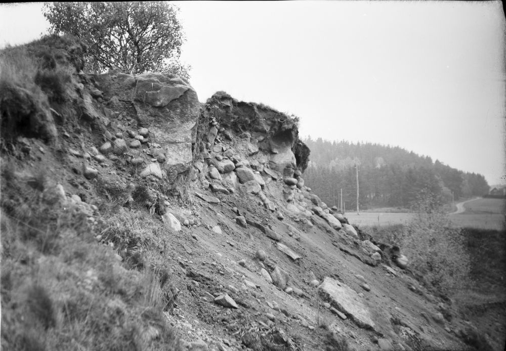 Hällkista vid grusgrop på Ingemarstorp. Här synes ena gravhällen. Nedrasad sidohäll.