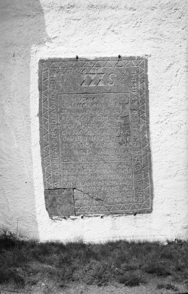 Gammal gravsten i kyrkväggen. Starrkärr